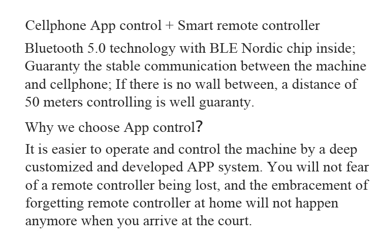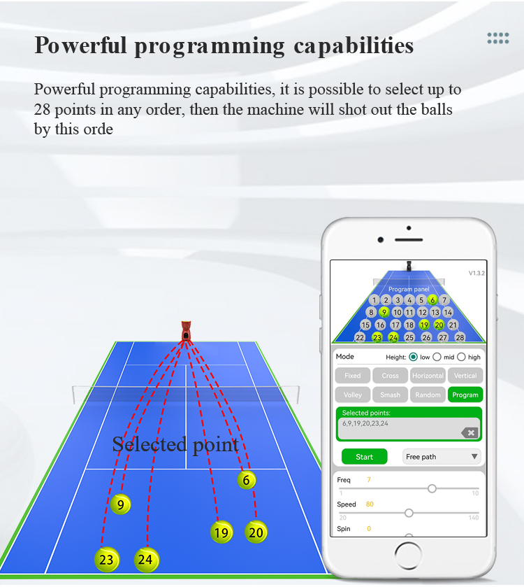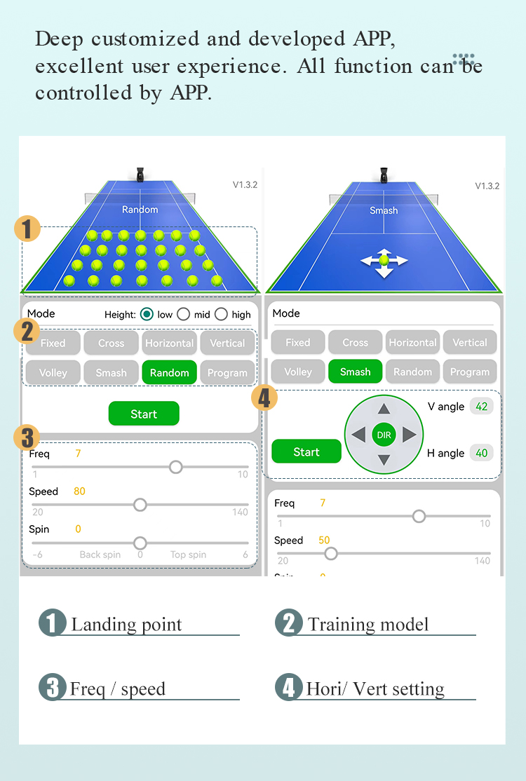Support APP remote control, with built-in professional training modes such as rotation, speed, and landing point. One click switch on mobile phone, precise customized training plan, efficient improvement of ball skills.